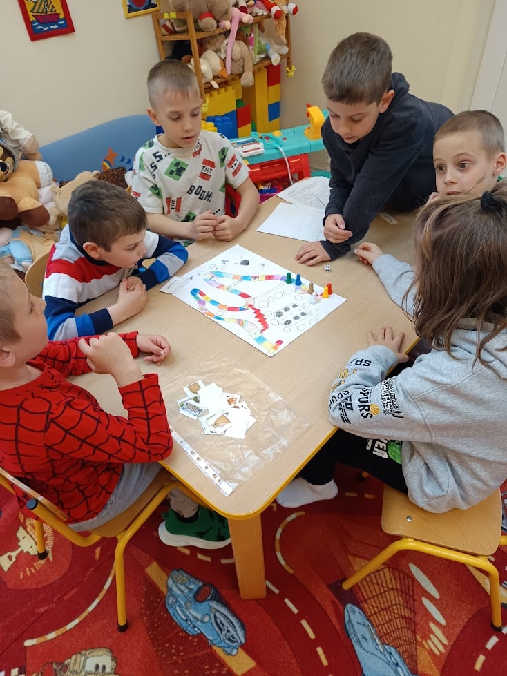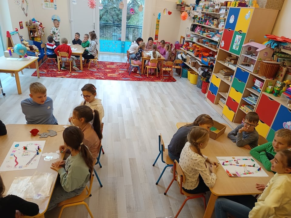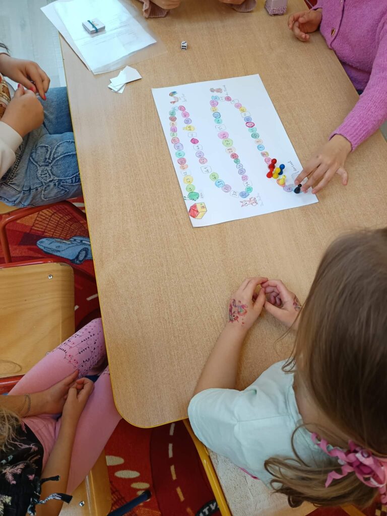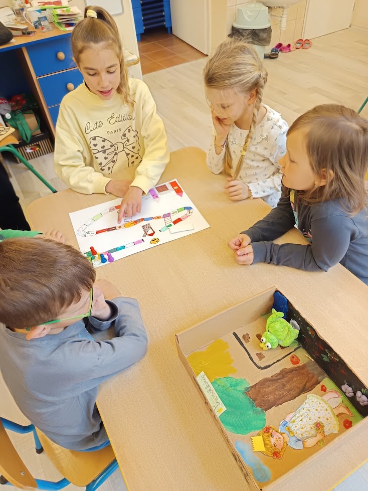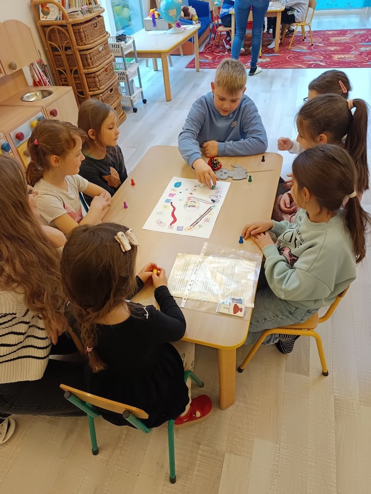 „Als große Schulkinder” kehrten die Drittklässler am Freitagvormittag in ihren geliebten Kindergarten zurück und verbrachten einen spannenden und abwechslungsreichen Vormittag mit den Vorschulkindern. In vier Gruppen spielten die Großen und Kleinen gemeinsam, und die selbstgemachten Gesellschaftsspiele der Schulkinder halfen den Kleinen, tiefer in die Geschichten von Der Froschkönig, Der gestiefelte Kater, Die Bremer Stadtmusikanten und Rotkäppchen einzutauchen – dabei lernten sie auch einige deutsche Wörter.