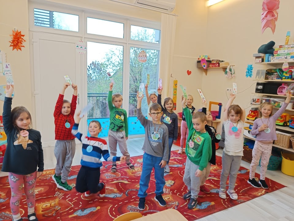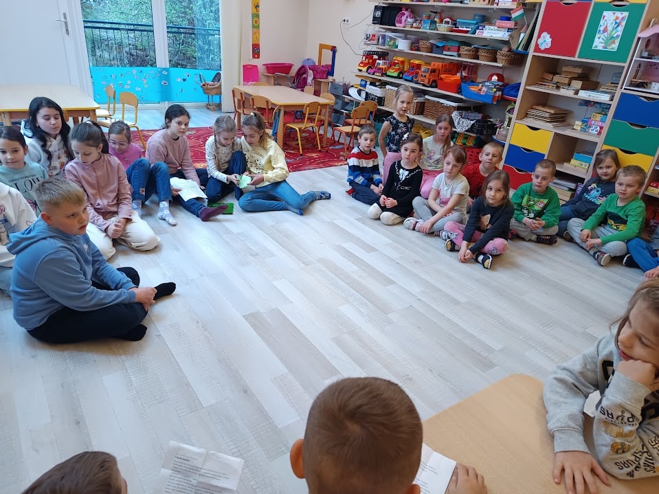 „Nagy iskolásként” tértek vissza pénteken délelőtt a harmadik osztályos gyerekek szeretett óvodájukba, ahol egy tartalmas, izgalmas délelőttöt töltöttek el a nagycsoportos óvodásokkal. Négy csoportban játszottak együtt kicsik és nagyok, az iskolások saját késztítésű társasjátékai segítették őket abban, hogy elmélyedjenek a Békakirály, Csizmás Kandúr, A brémai muzsikusok és Piroska és a farkas történetében, miközben német szavakat is tanultak. Meglepetésként egy -egy -szintén saját készítésű- könyvjelzőt és medált adtak, melyeket az óvodások örömmel fogadtak.